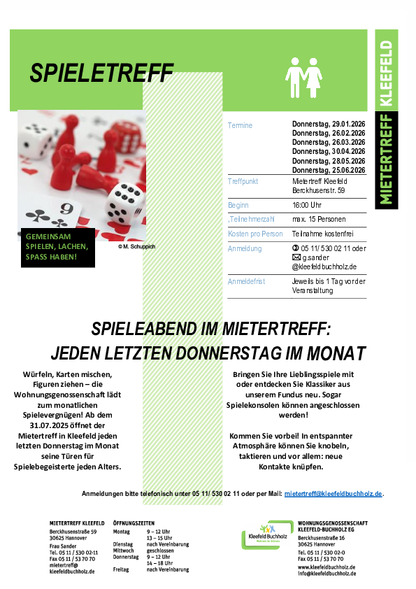 SPIELENACHMITTAG IM MIETERTREFF: Würfeln, Karten mischen, Figuren ziehen – die Wohnungsgenossenschaft lädt zum monatlichen Spielevergnügen!