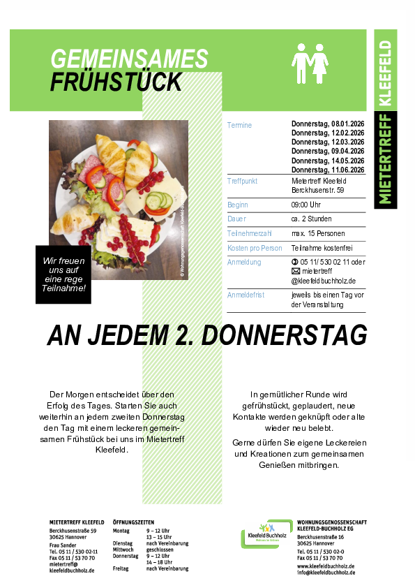 Anmeldung: Telefon: 05 11/ 530 02 11 oder per E-Mail: mietertreff @kleefeldbuchholz.de