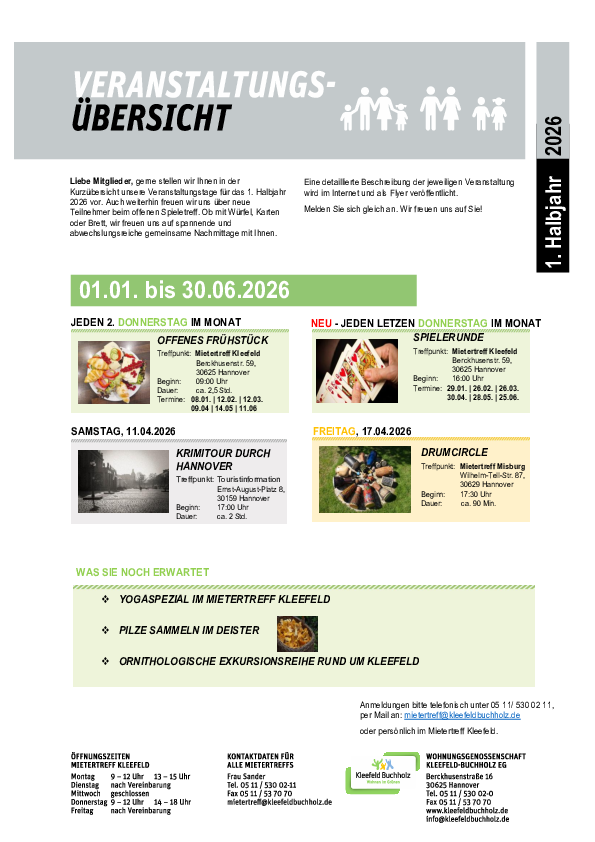 Liebe Mitglieder, wir freuen uns Ihnen hier wieder unsere besonderen und wiederkehrenden Veranstaltungstage für das 1. Halbjahr 2026 in der Kurzübersicht präsentieren zu dürfen. Ausführliche Beschreibungen für jede Veranstaltungen finden Sie im Internet und als Flyer im Mietertreff Kleefeld.