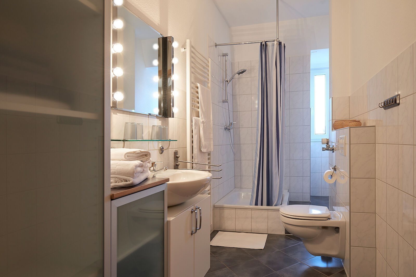 Im Bad jeder Gästewohnung befindet sich entweder eine Dusche oder eine Badewanne. Außerdem stellen wir Ihnen WLAN zur Verfügung. Eine Waschmaschine und einen Telefonanschluss bieten wir nicht an.